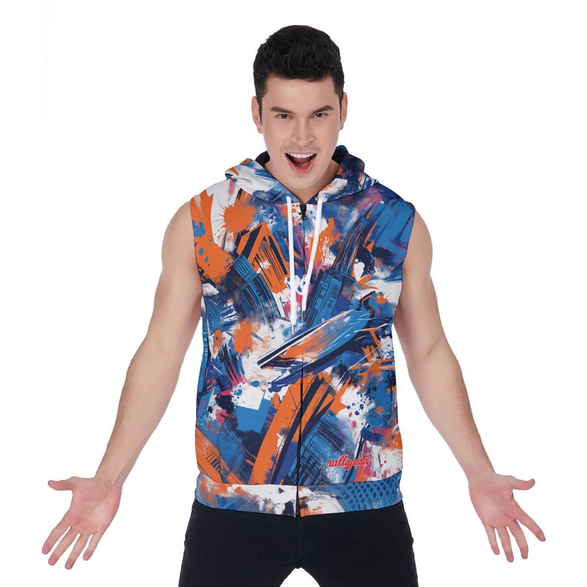 Introducing the All-Over Print Men's Zipper-Up Sleeveless Hoodie in the eye-catching color combination of New York Blue, Orange, and Black. Perfect for those who want to stand out from the crowd, this hoodie features a stylish zip-up design and a comfortable sleeveless fit.